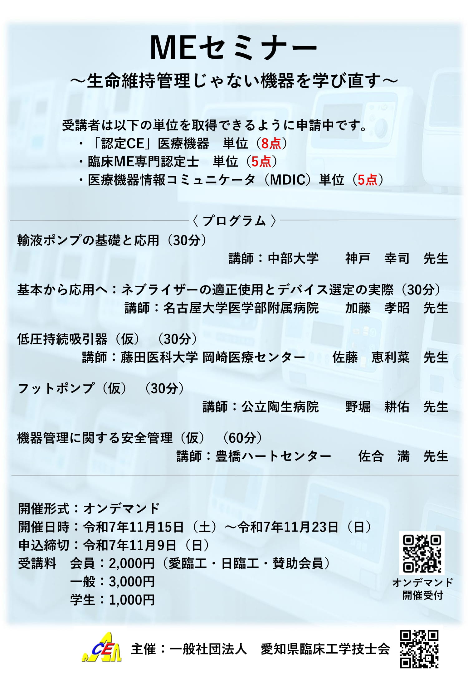[受講料]:愛知県ならびに日本臨床工学技士会会員3,000円