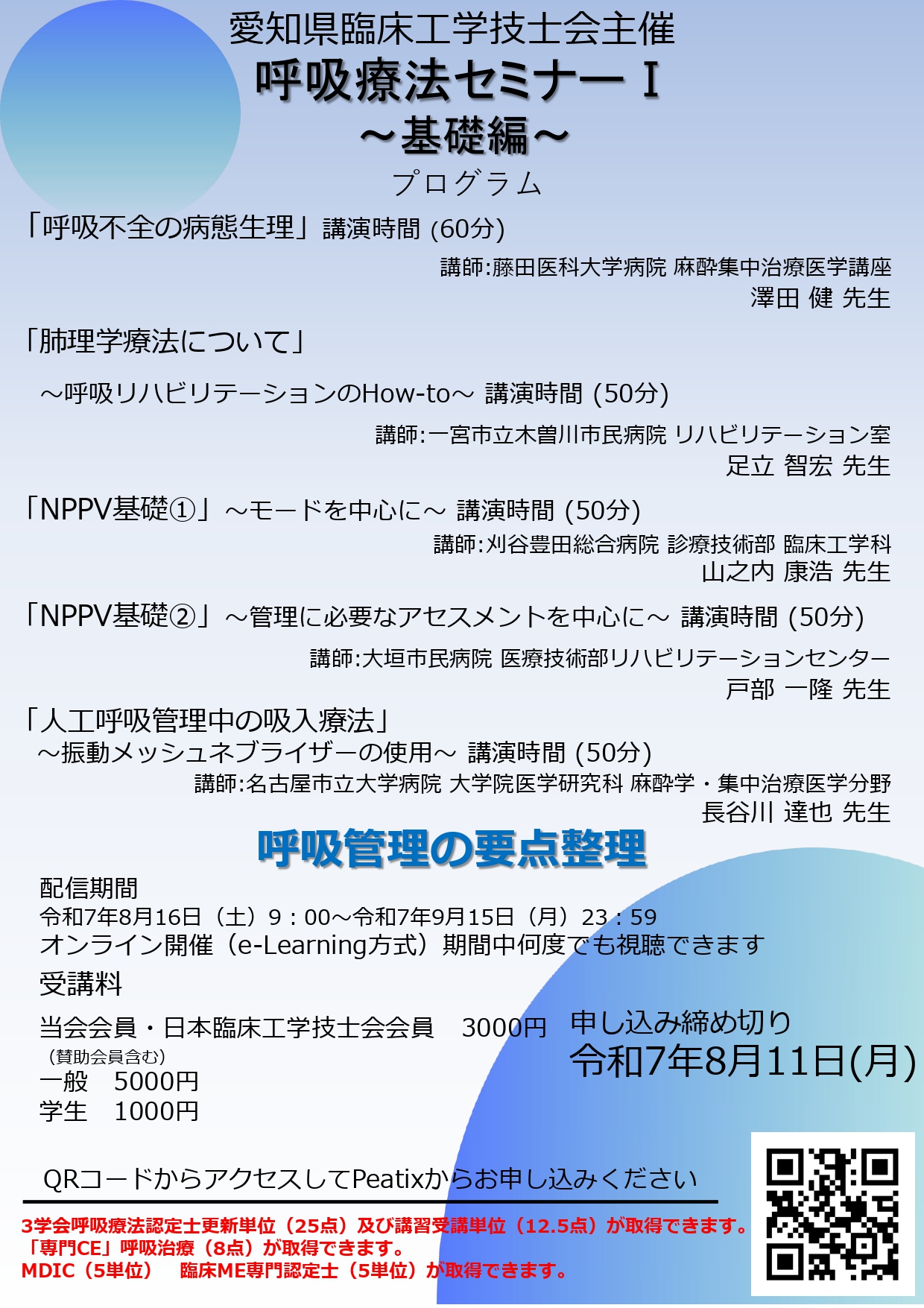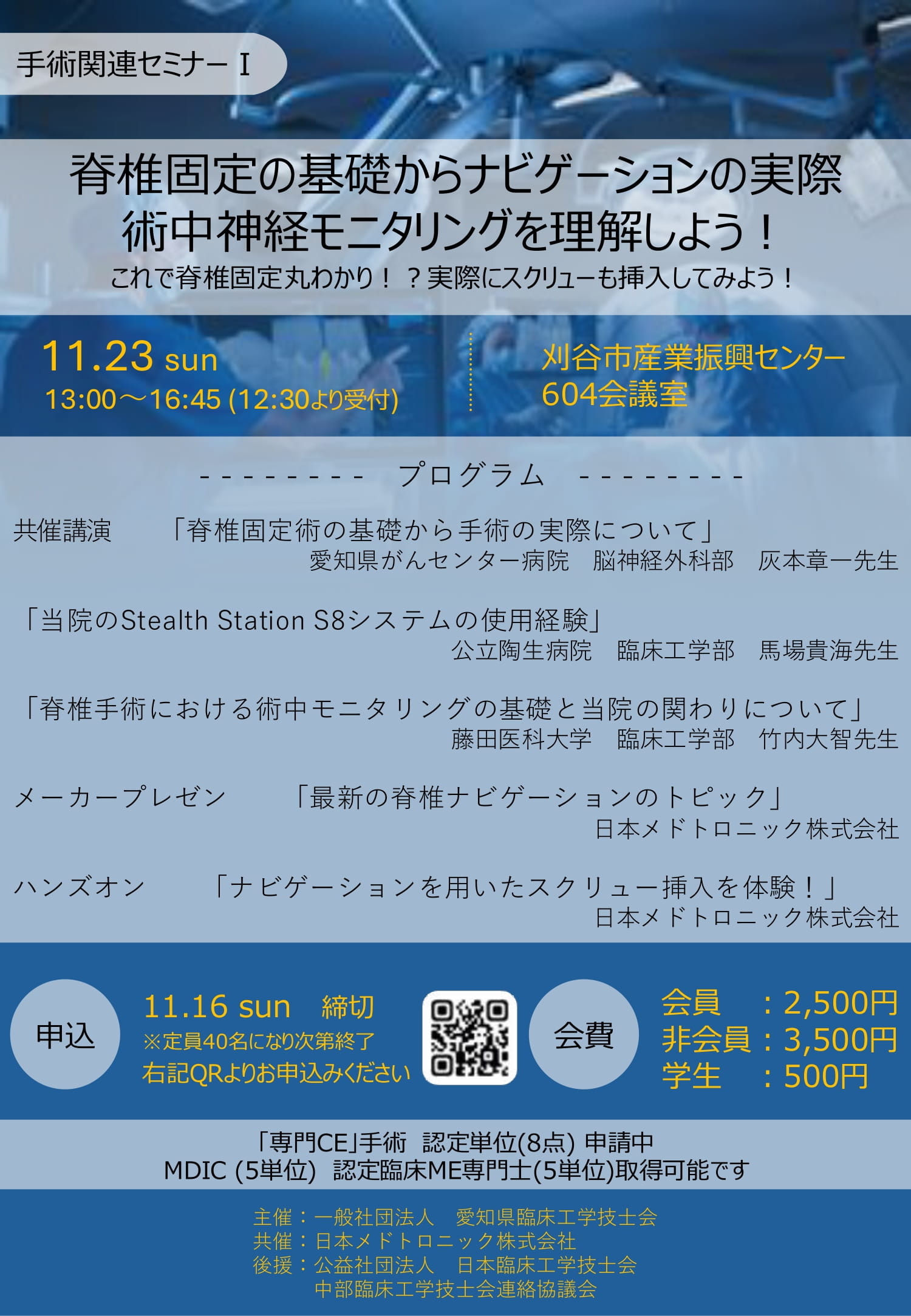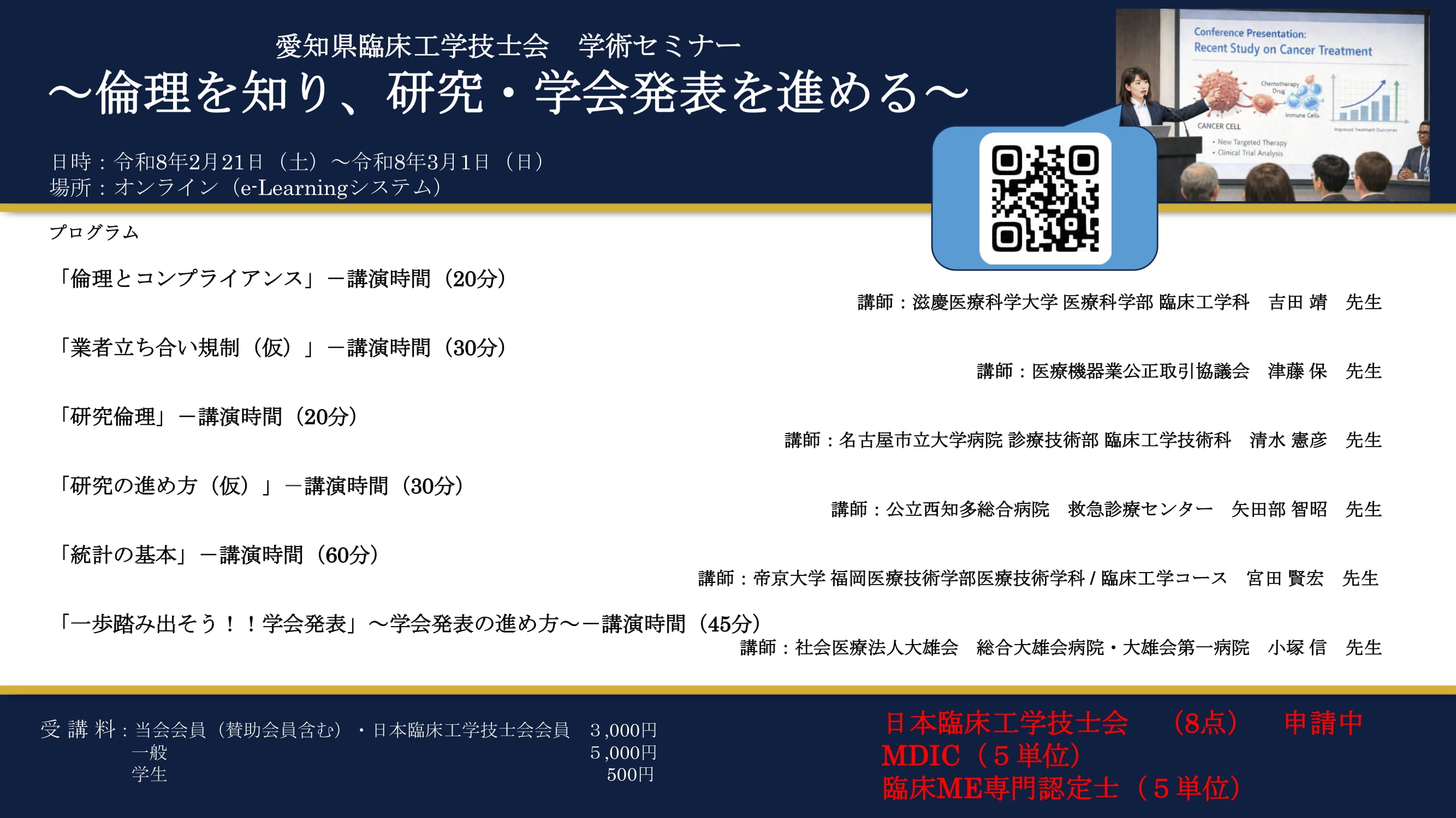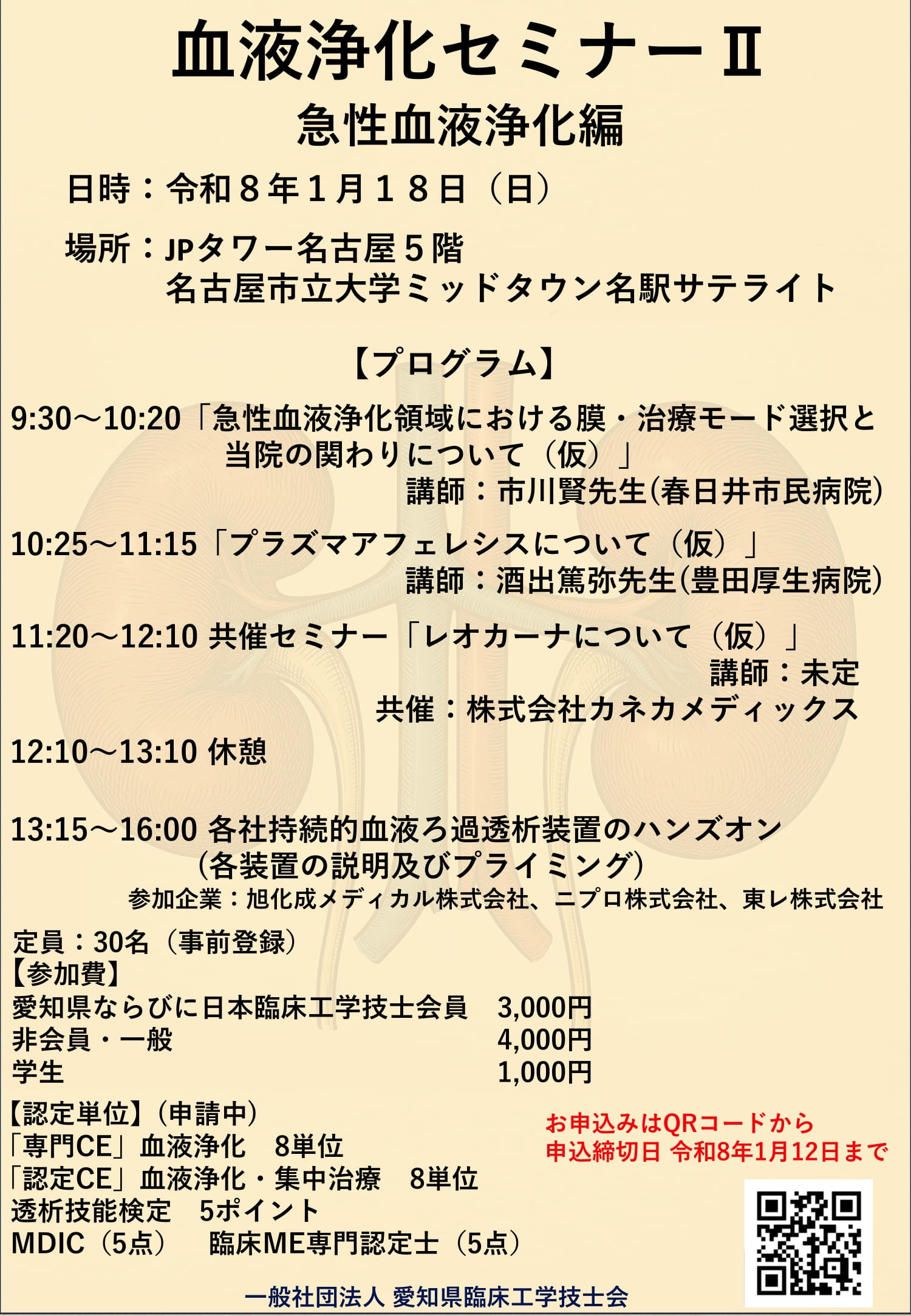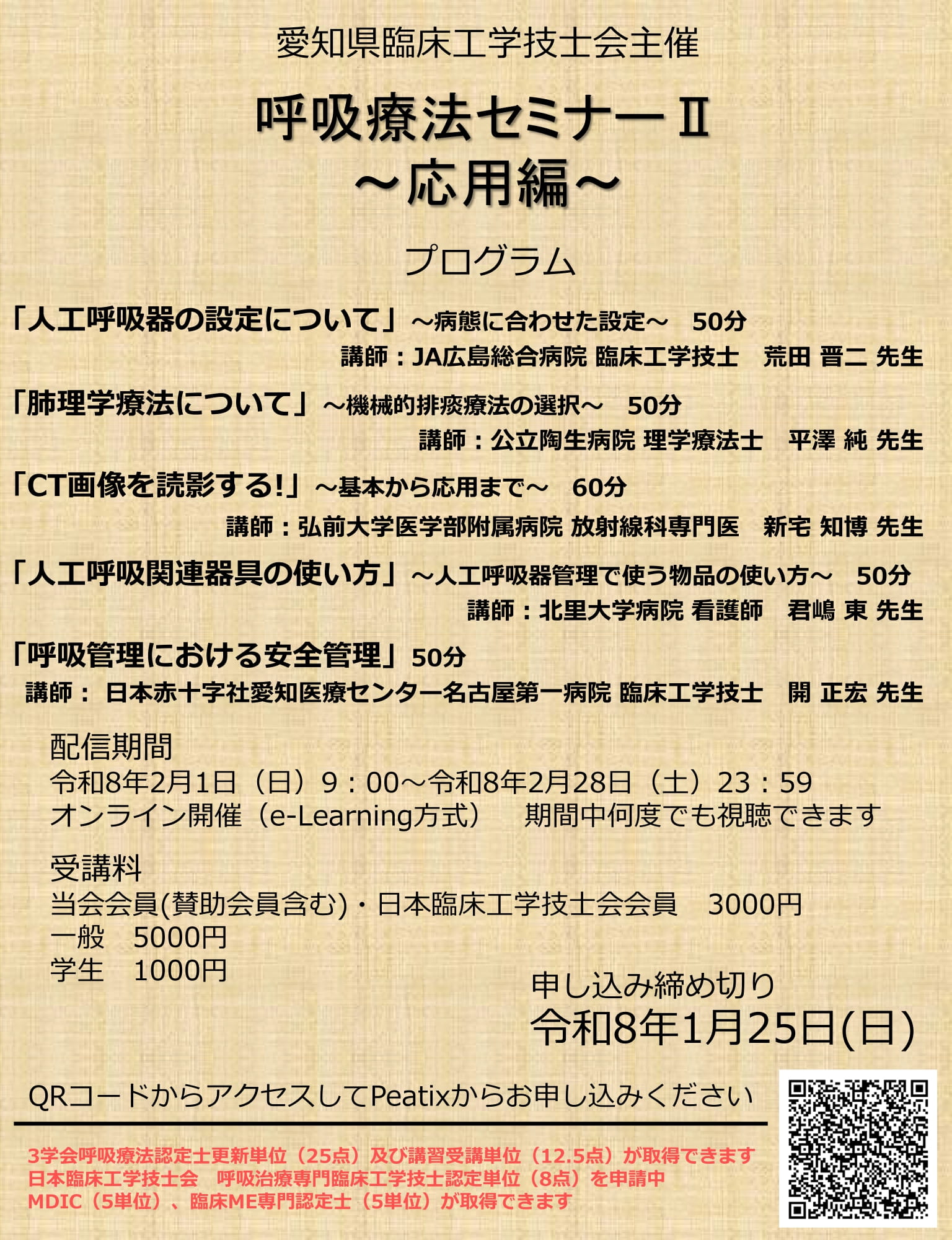 [受講料]:愛知県臨床工学技士会会員(賛助会員含む)・日本臨床工学技士会会員 3,000 円