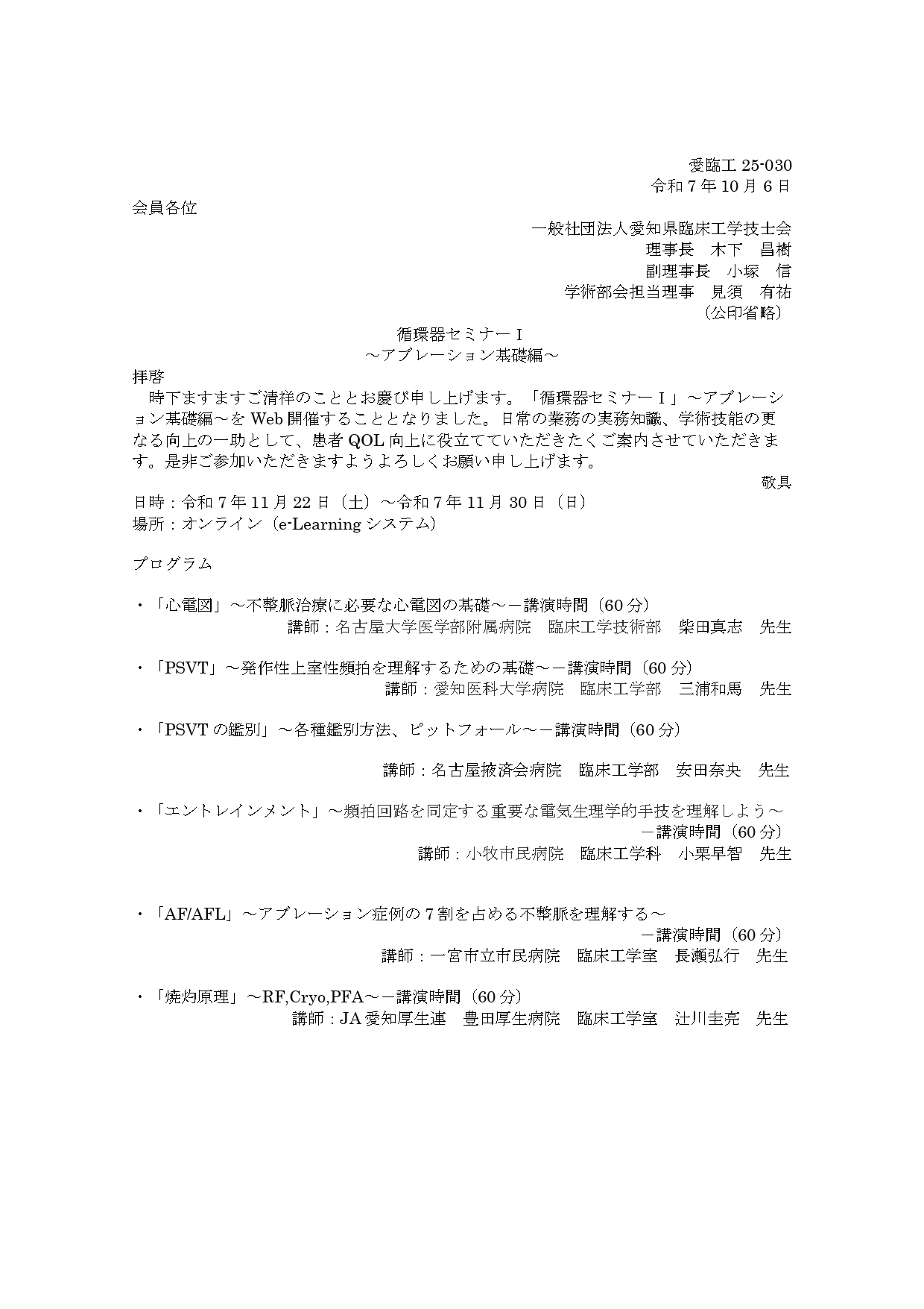 愛知県臨床工学技士会 循環器セミナーⅠ 開催に関するお知らせ