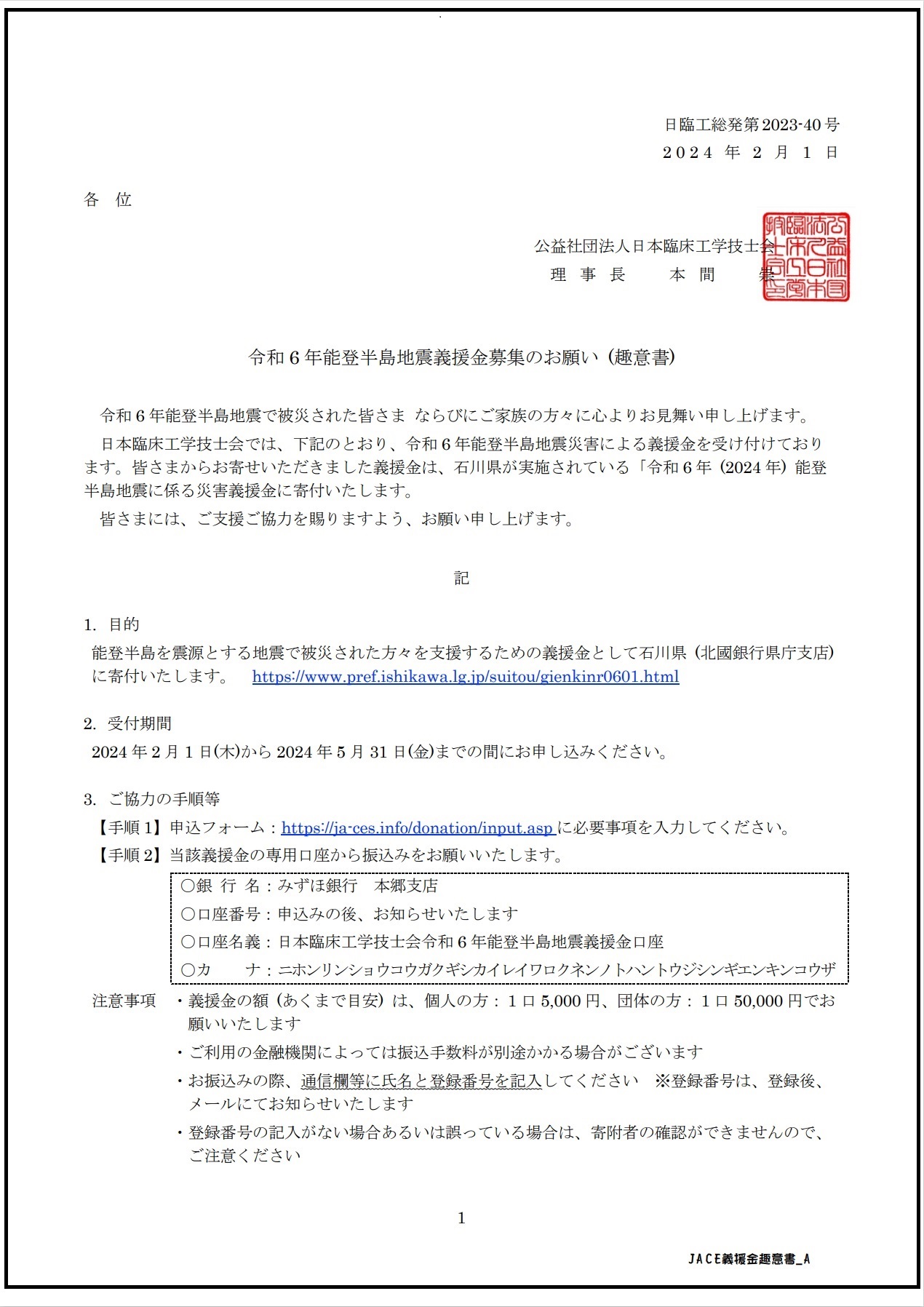 | 29日 | (Th) | (一社)富山県臨床工学技士会 | 令和6年度 定時総会 会告案内 令和6年度 定時総会 議案書・委任状(ハガキ) 令和6年度 年会費納入のお願い 令和6年度 年会費振込用紙 第14回 学術大会案内チラシ 情報化推進事業協力のお願い ... 発送 |