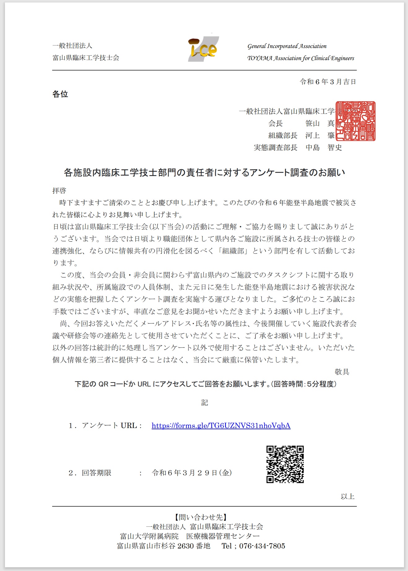 一般社団法人富山県臨床工学技士会 定時総会 第13回 一般社団法人富山県臨床工学技士会 学術大会 ... 開催 |
