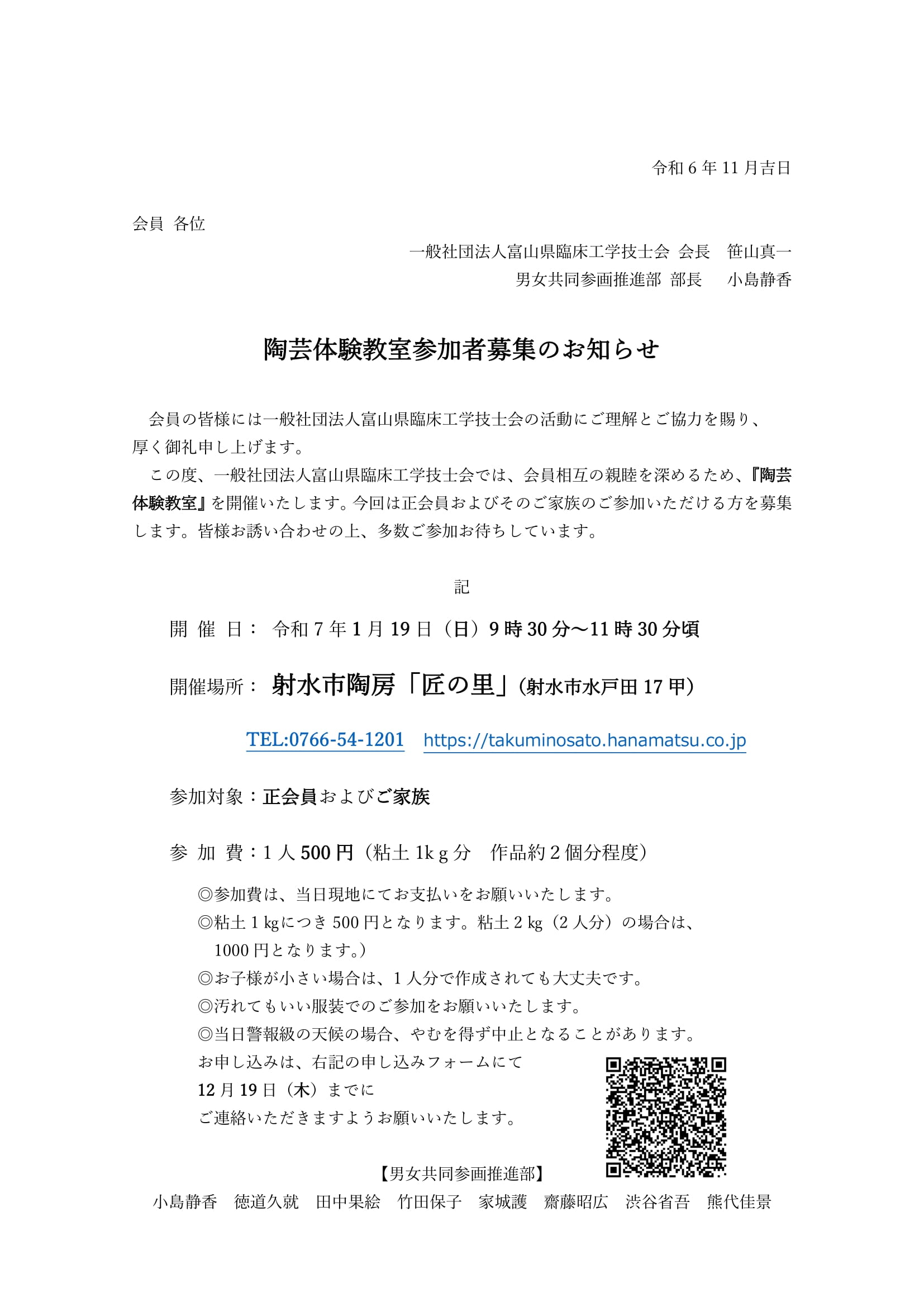 | 19日 | (Sun) | (一社)富山県臨床工学技士会 | 男女共同参画 陶芸教室 開催 |